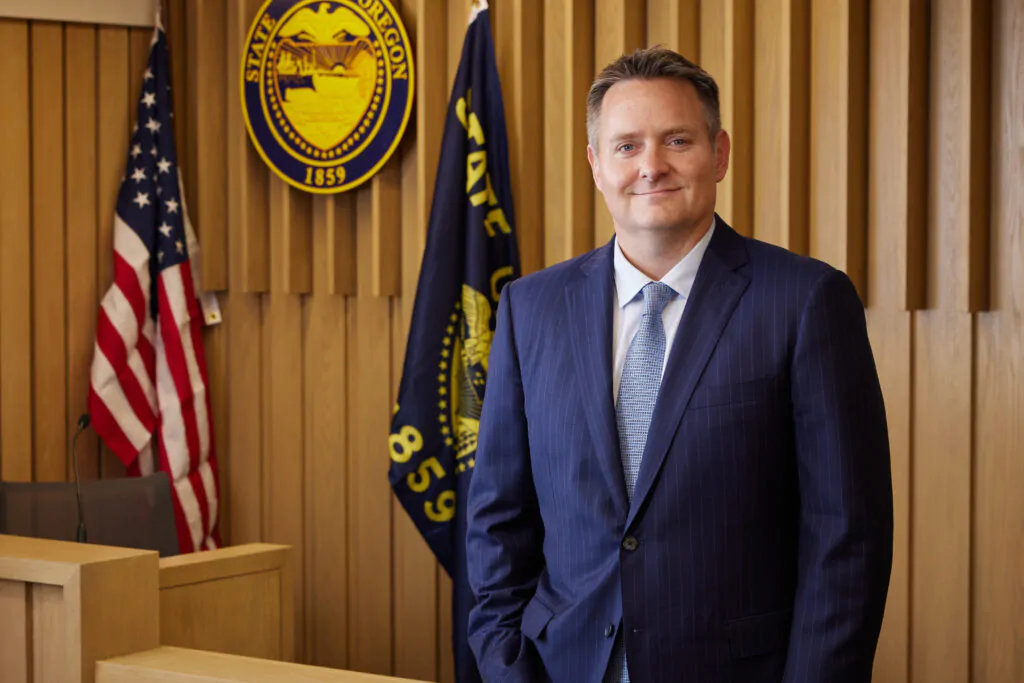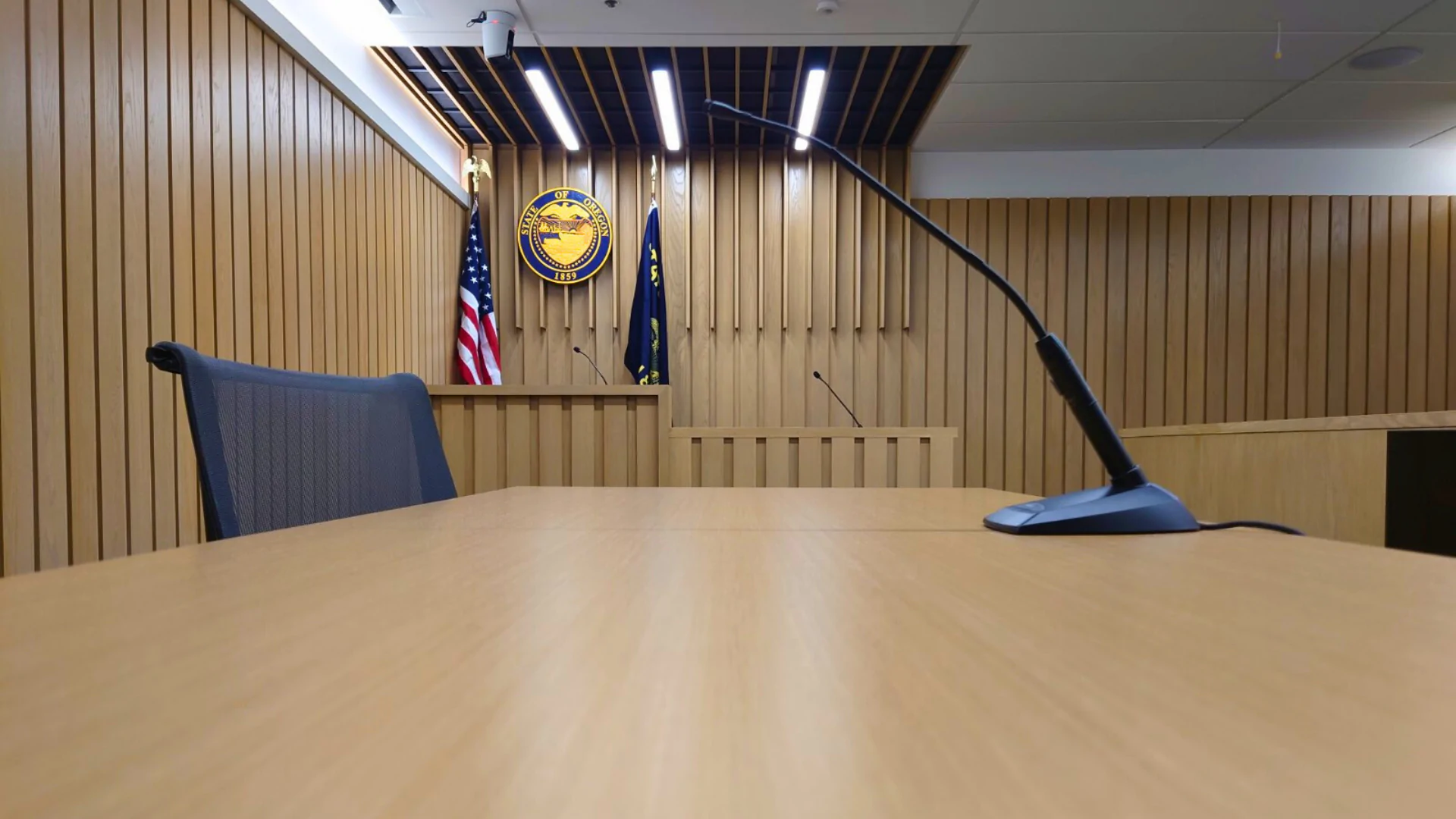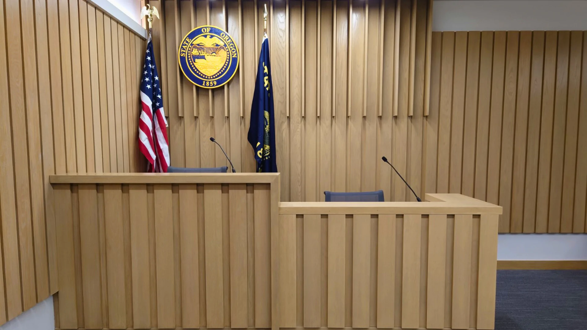 The Johnston Law Firm courtroom mirrors the look and feel of a real Multnomah County, Oregon courtroom—down to the smallest detail. Clients enter a space designed to reduce uncertainty and sharpen focus before the real trial begins.