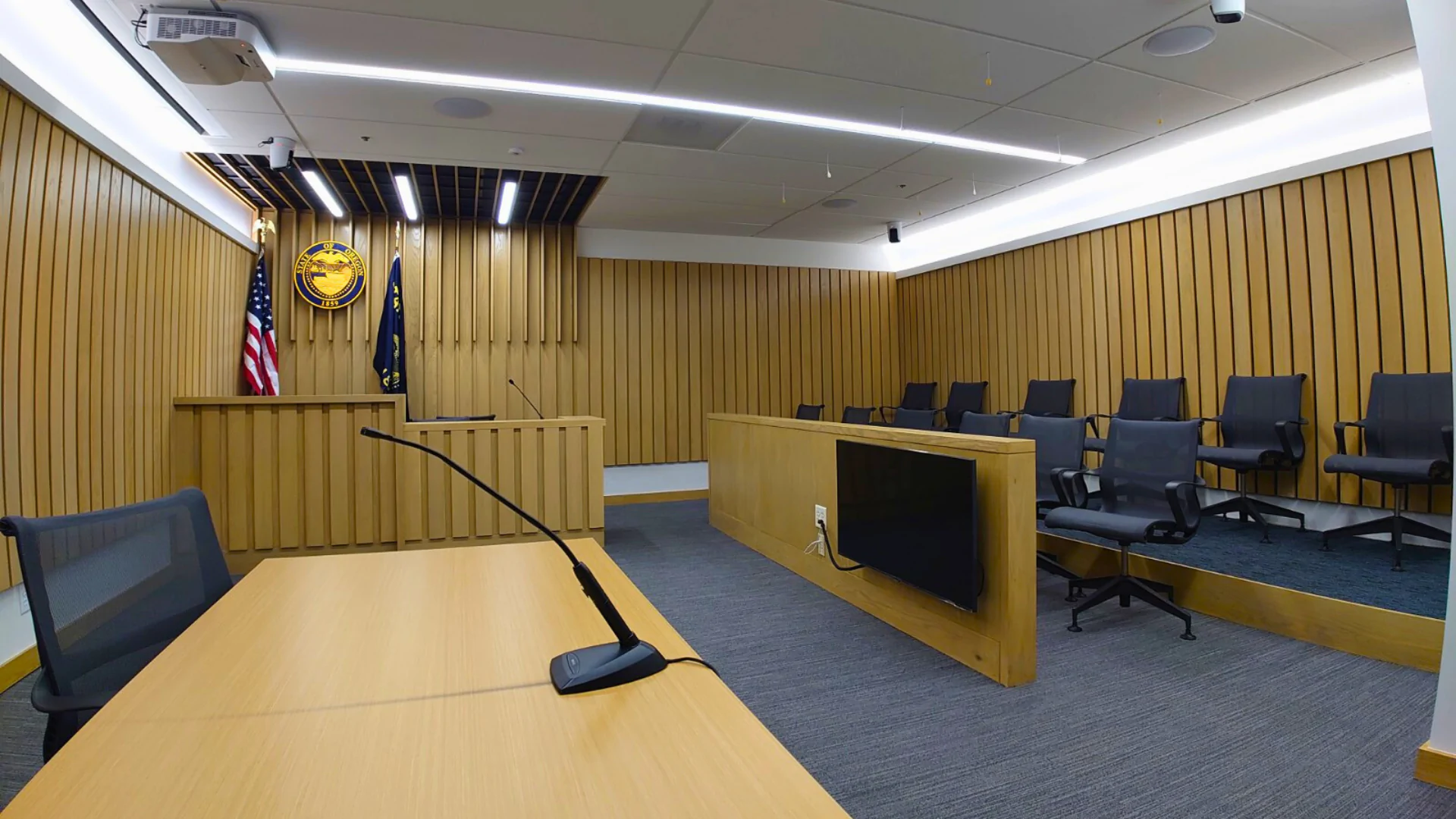 • Exact replica of a Multnomah County courtroom (county seal, carpet, wood paneling, ceiling tiles)